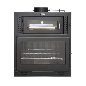 Saber másBarbacoa con horno FOGOSUR M100 en acero con horno de ladrillo refractario, rejilla fundido, termómetro y cristal cerámico; máxima eficiencia y salida Ø300.