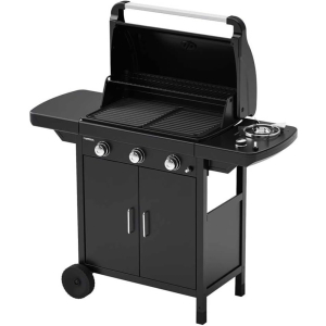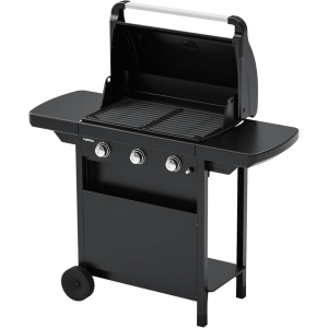Saber másBarbacoa compacta Campingaz 3 L con 3 quemadores de acero aluminizado y mesas laterales plegables, fabricada en Italia.