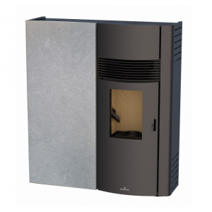 Estufa de pellets BRONPI modelo ADRY-P-G de 11 kW extraplana en color gris con acabado en piedra