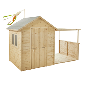 Saber másCasita infantil de madera Soulet EUGÉNIE con porche cubierto, diseño seguro y fácil montaje en jardín.