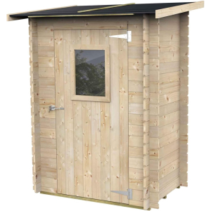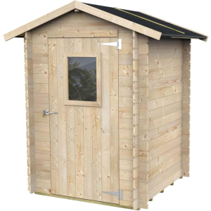 Saber másCaseta adosada ALCE Bh19 Hobby Monofalda 146x98 cm de abeto natural 19 mm con puerta simple con ventana. Techo y suelo OSB3, base autoclave y certificación PEFC.