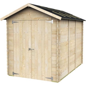 Saber másCaseta de jardín ALCE Bh19 Regis 198x198 cm fabricada en abeto natural 19 mm con puerta simple con ventana. Techo y suelo machihembrado, base tratada y certificación PEFC.
