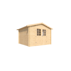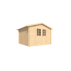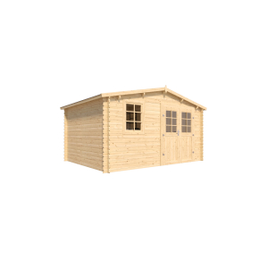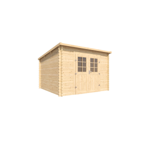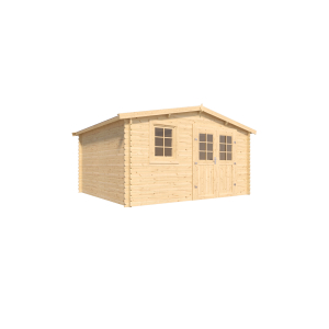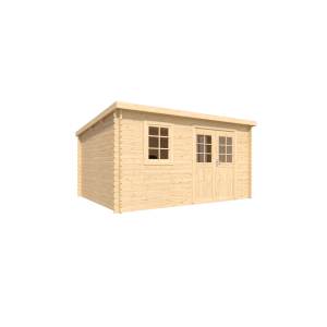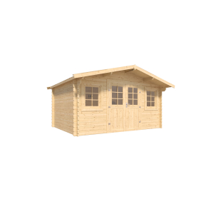Saber másCaseta de madera Vallo Modern 12 m² con ventana oscilobatiente, puertas de cristal y techo de fieltro. Cobertizo de jardín resistente para almacenaje amplio.