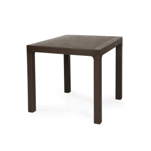 Mesa TROPICAL ratán polipropileno chocolate 80x80 cmFabricada en polipropileno imitación ratánColor marrón chocolate resistente al exteriorUso en hostelería o jardínEstructura ligera y muy resistente Saber más